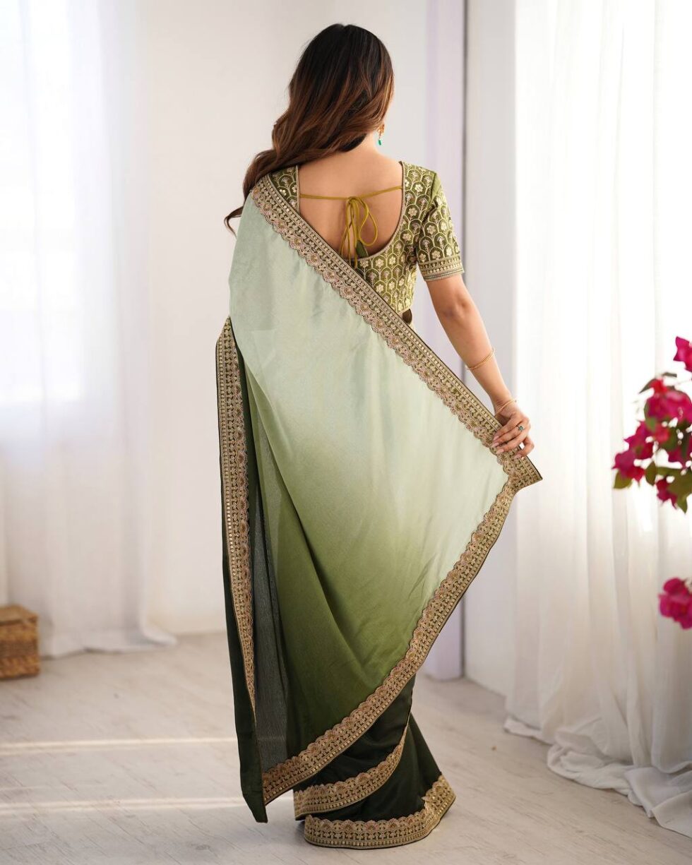 Grace any occasion with this beautiful Chinon Silk saree, exquisitely designed with intricate thread and sequence lace work. The saree boasts a generous 5.5-meter cut and is lightweight at just 0.800 grams. It comes with an unstitched Mono Bangalore blouse featuring matching thread and sequence work, sized at 0.80 CM. This elegant set, perfect for a sophisticated look, is available for ₹4,399.00.